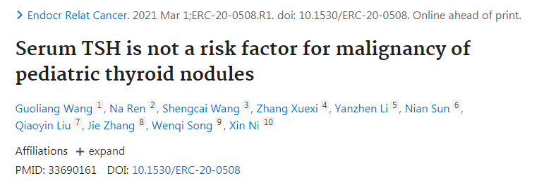 总而言之,血清TSH水平似乎不是儿童甲状腺结节患者的致癌因素,也不是早期儿童甲状腺癌特征的独立风险因素。