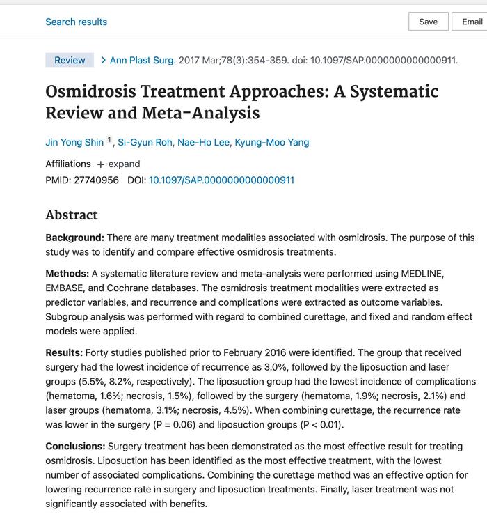 关于这个问题,在我之前的科普文章内有过很详细且形象地解释《手术到底能不能祛除腋臭?》。但这次我要换个方式:在2017年整形外科年刊上发表了文章Osmidrosis Treatment Approaches: A Systematic Review and Meta-Analysis(腋臭治疗方法的系统回顾与Meta分析).该分析明确写着:在众多治疗方式中,手术治疗腋臭的复发率最低(3%);其次是抽吸(5.2%)和激光治疗(8.2%),在做了大量的数据回顾和分析后,文章最终的结论是:Surgery treatment has been demonstrated as the most effective result for treating osmidrosis(手术治疗腋臭最为有效).有权威的科研结论背书,有多年临床结果参照,有成千上万的患者因此获益,我不明白为什么还是会有人相信网络上随便一搜,夸大其词的机构和医生。那些治疗患者数量不详,治疗单位不清晰,甚至术后没有随访结果的治疗真的比手术来得更好吗?