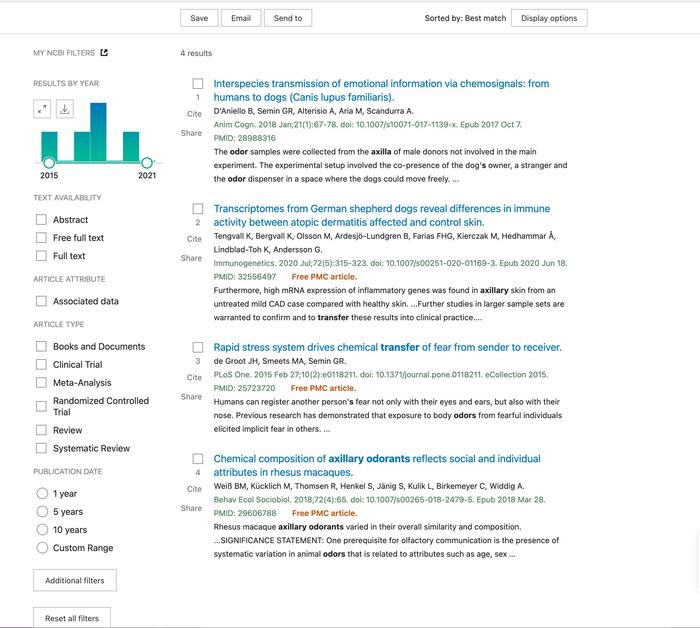 那么我给出简单且负责任的回答:不会。那么为什么我那么笃定呢?请往下看:Pubmed是全球最大的医学文献搜索引擎,当我键入Body odor,显示从1779年-2021年关于体臭的科研文献是2552篇,当你键入bromhidrosis或者underarm odour 又或是axillary odor这些指示为腋臭的关键词时,搜索结果均明显低于这个数字(其中axillary odor最高为352篇),且大部分文献与之前搜索结果重叠。那么好,我在Body odor范围内进一步搜索Body odor transfer (体臭转移)或者axillary odor transfer,结果一共得到4篇,请看下图: