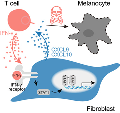 2021年12月16日,北京生命科学研究所/清华大学生物医学交叉研究院的陈婷研究团队在Nature杂志上发表了题为 Anatomically distinct fibroblast subsets determine skin autoimmune patterns的研究论文,通过单细胞转录组测序、小鼠模型和一系列遗传学实验方法,揭示了皮肤成纤维细胞在白癜风疾病中的重要作用:成纤维细胞是唯一必需的能招募和激活自体活性CD8+ T细胞的皮肤细胞;不同部位成纤维细胞对IFN-γ的响应能力决定其招募CD8+ T细胞的能力,并决定白癜风的发病位置偏好。
