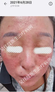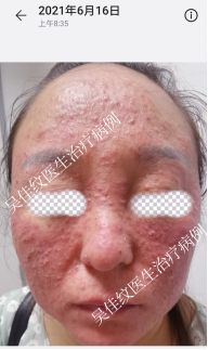 2021.06.16面部玫瑰痤疮症状严重的女性患者,经过不到两个月医生与患者联合努力后: