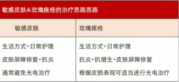 除了症状相似以外,它们初期的治疗思路基本一致。虽然敏感皮肤以提高皮肤耐受性为主要目的,而玫瑰痤疮的治疗原则是缓解或清除临床症状。但它们都是以阻断症状的发生机制为主,控制皮肤炎症的同时修复好皮肤屏障。