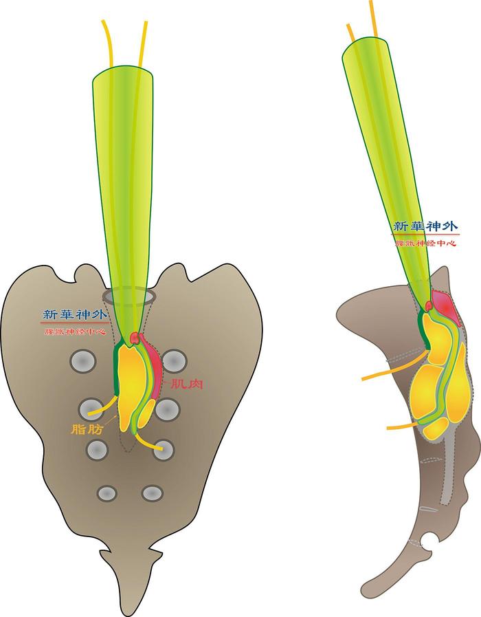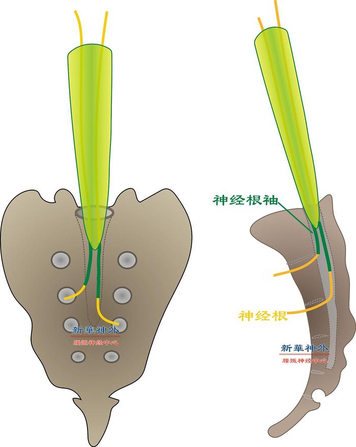 图3:神经根示意图。神经根(黄色)在硬脊膜囊内是裸露的,但是当它钻出硬脊膜囊的时候,它的外面包裹了一层硬脊膜(绿色),它是硬脊膜囊的延续,好比袖子是衣服的延续一样,所以称之为神经根袖,但是神经根袖的内部正常是没有脑脊液的,相当于一个紧身袖。图中只画了2根神经根作为示意,实际骶管内有12根神经根,骶管的内径大约1.5cm,这些神经根基本占满了骶管,神经根之间有少许间隙,间隙里是少许脂肪组织,起着隔离神经根、缓冲和防粘连的作用。