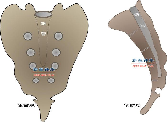 图1:骶管的骨性结构。骶骨位于骨盆的后正中,腰椎的下方、尾椎的上方。骶骨是由五节融合而成的(骶1--骶5)。骶管就是骶骨中间的一根骨性管道。