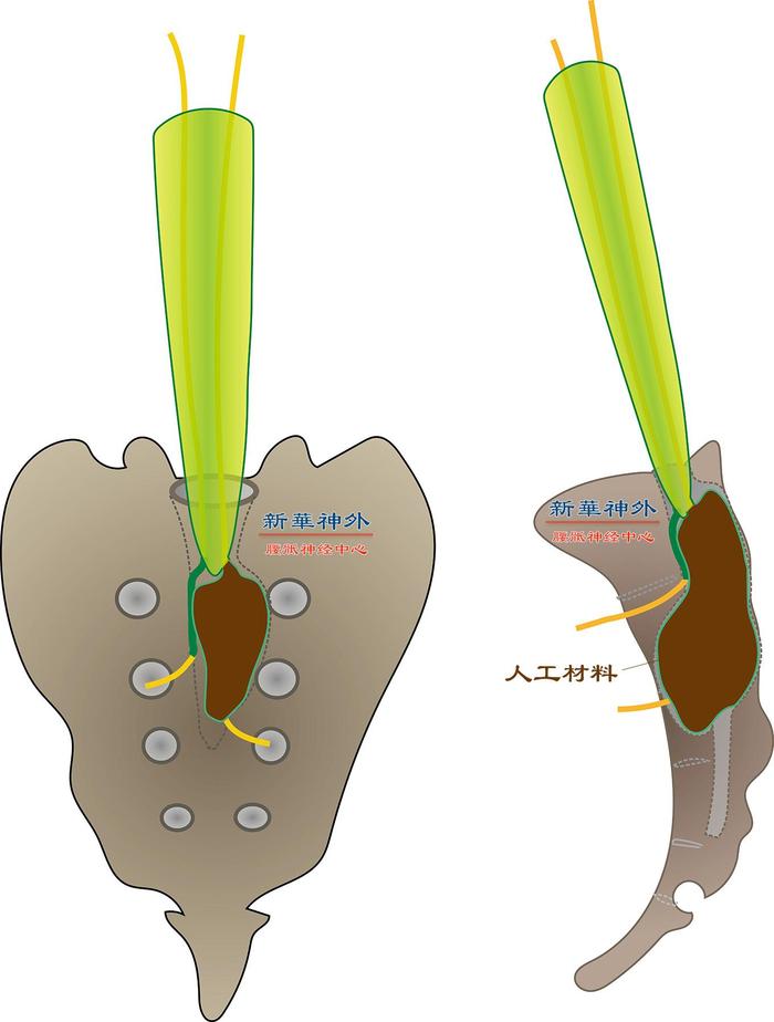 图7:如何处理被撑大的骨性骶管。由于骨质没办法再生,所以我们用自体的肌肉和脂肪去填充这个骨性骶管,这是因为正常生理状态下,骶管中本身就是有脂肪组织的,所以骶管囊肿术后,磁共振表现是脂肪、肌肉,三个月左右,随着脂肪少量液化,磁共振上会有少许液体信号。