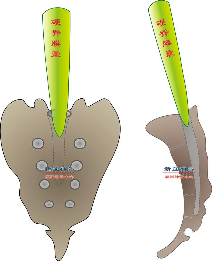 图2:硬脊膜囊底部一般位于骶1水平。硬脊膜囊上连颅腔,内部充满了脑脊液,像是一个很高的水桶。由于人直立生活,所以硬脊膜囊底部的静水压非常高(1100mm水柱,约1/9标准大气压)。假设在硬脊膜囊底部插入一根细针头,脑脊液就会喷涌而出。然而,在骶管里却是零压力,甚至稍呈负压,临床上做骶管注射时,针尖一旦刺入骶管,少量药物会自动被吸进去,说明存在少许负压。