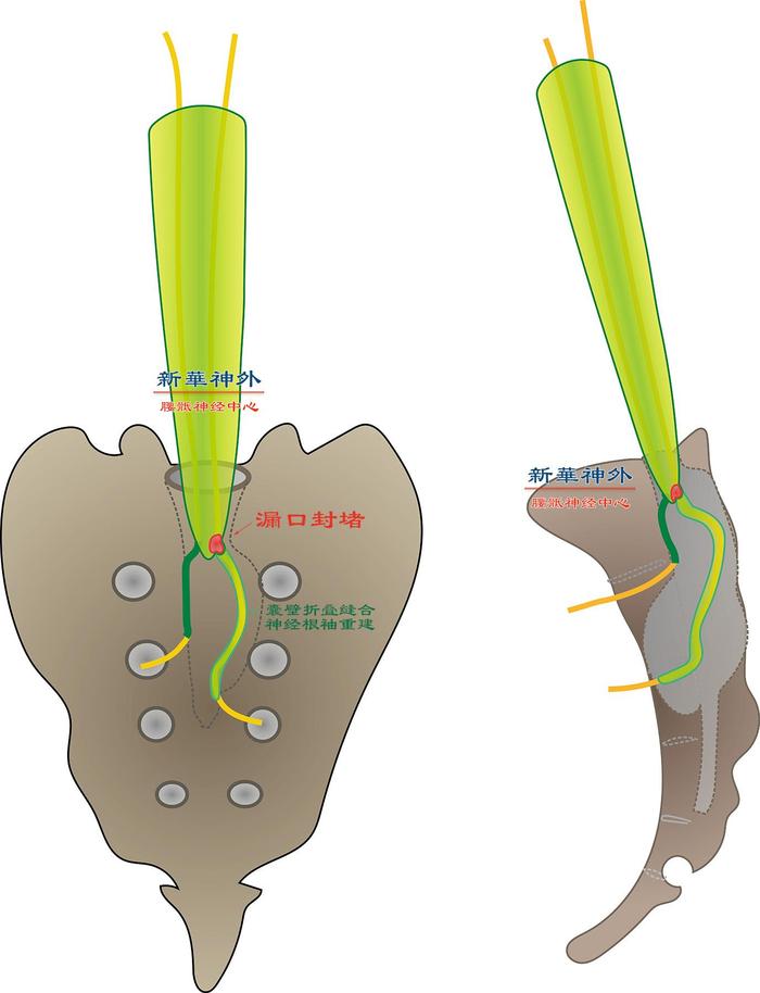 图6:理想的手术方案,应该是尽可能向生理的方向去修复————虽然恢复不到正常生理状态,但应尽量朝这个方向去努力。(1)既然疾病的始动环节是神经根袖出口处先天性薄弱,然后被脑脊液撑大,变成漏口,那么骶管囊肿手术最核心的技术就是通过显微缝合,用一小片肌肉把这个漏口封堵住,应尽量做到滴水不漏,同时又不损伤穿行的神经根。(2)如上述,疾病的第二环节是脑脊液漏进神经根袖,越撑越大,神经根袖(即囊肿壁)变得越来越薄;所以我们封堵成功之后,吸除囊肿内部的脑脊液,确认不再有任何脑脊液流入,这时把耷拉下来的囊肿壁(即神经根袖),尽可能折叠起来,包裹神经根,重新变成一个紧身袖。(3)上面两步完成之后,大体就接近了生理状态的硬脊膜囊和神经根袖了,但是,被撑大的骨性骶管还在啊,怎么办?有没有办法让骨头重新长起来,变回原来的模样,可惜没有这种方法。