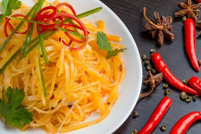 酸辣土豆丝:很常见的家常菜,不过为了口感,在处理土豆丝时,会用水洗去淀粉并且用很多油来快炒,这样既会造成大量维生素C流失,而且热量也高。