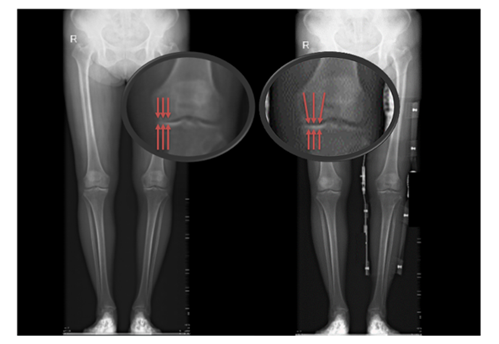患者未佩戴(左)和佩戴(右)新型矫形支具负重位下肢全长X线片