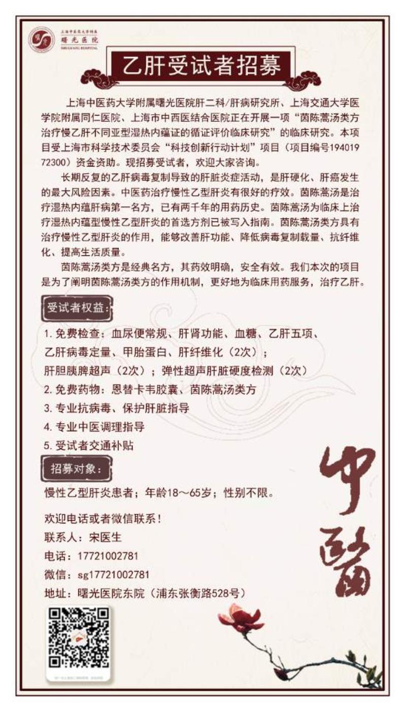乙肝患者看过来 2020年09月23日 7965人阅读 返回文章列表 这是上海中医药大学附属曙光医院孙明瑜教授主持的一个上海市科技委员会的项目,为大家提供优质的医疗和指导。《伤寒论》经典方剂治疗,两千多年的经典名方,中西医结合治疗安全有效。目前已经有数位完成治疗出组患者,效果很好,不只是肝功能恢复正常和病毒检测不到,身体各方面都明显好转!欢迎大家联系我们!也欢迎多多转发,让更多的人受益![握手][握手][抱拳][抱拳]直接联系宋博士! 顶 0 分享到: