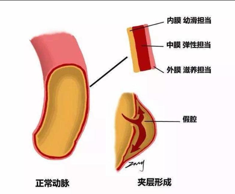 动脉分内膜、中膜和外膜三层。夹层,即血液经内膜破口进入内膜-中膜之间,形成血肿,并沿血管长轴延伸。
