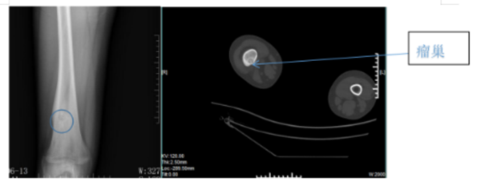 小唐:4月前剧烈运动后自觉左大腿外侧有刺痛感,夜间加重,白天活动不受影响。外院诊断运动损伤,没有做进一步的影像学检查,用外贴膏药治疗。无明显好转,来我门诊就诊时,X片和CT能清楚的显示出骨样骨瘤的位置,大小,以及对骨骼的影响。