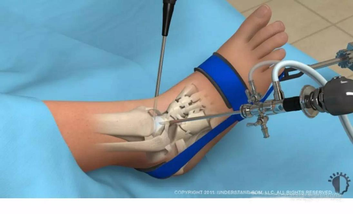 什么是踝关节镜?就是在踝关节内或外侧取5毫米左右的小口子,将一根吸管粗细的镜头伸进关节腔内,把里面的结构通过光纤传送到外面的屏幕上。医生通过屏幕,可以清楚的看到里面发生了什么样的病变。然后在病变处取5毫米左右的小口子,放入射频刀头或者其他工具,对病变处进行治疗。我们就称之为踝关节镜手术,是一种微创手术。