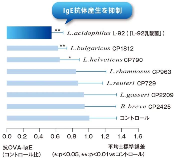 结果表明,「L-92乳酸菌」有很高的抑制IgE抗体产生的能力。