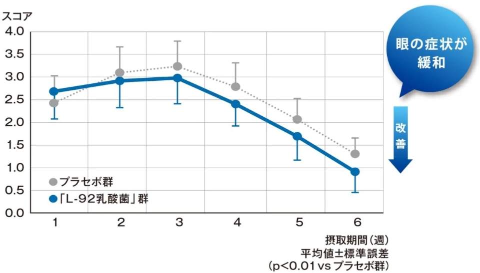 结果表明,摄入了「L-92乳酸菌」的人群和没有摄入「L-92乳酸菌」「L-92乳酸菌」的人群对比,医药品的使用频率有所降低,并且眼部的症状得到了改善。