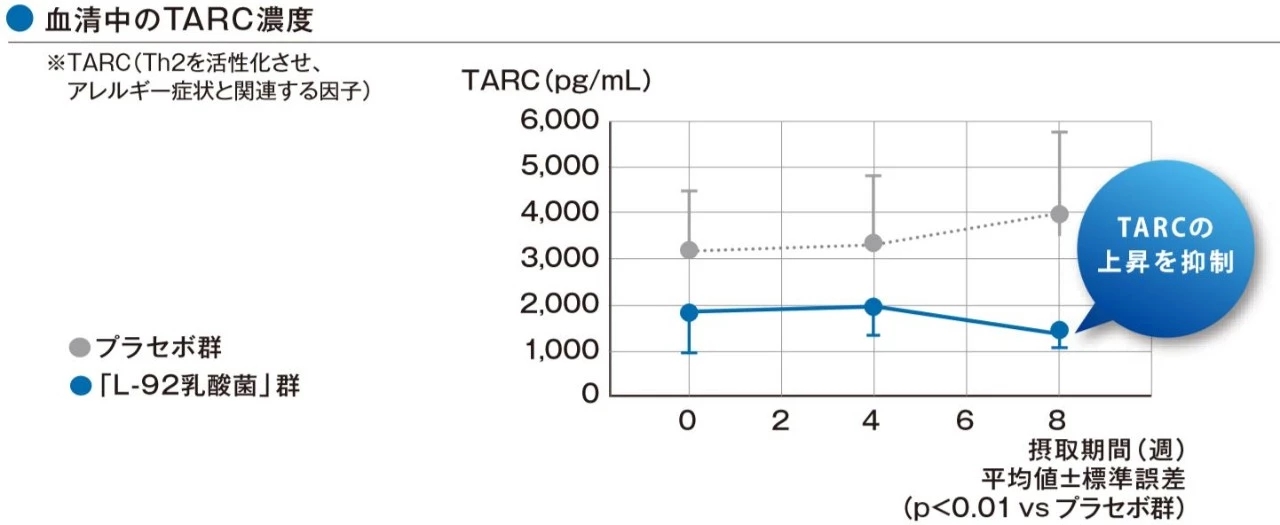 这证实了通过摄取「L-92乳酸菌」,可缓解成人的过敏性皮炎症状。而且也可看出「L-92乳酸菌」可增加调整免疫的Treg,能通过调整免疫平衡改善过敏症状。