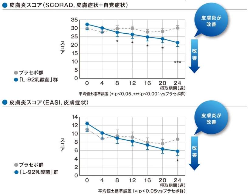 结果表明,吸收了「L-92乳酸菌」的群体对比没有吸收「L-92乳酸菌」的群体,其皮肤得分(特应性皮炎积分以及湿疹区和严重度指数)得到了改善。