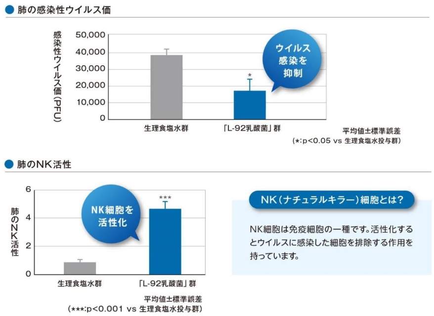 结果显示吸收了「L-92乳酸菌」的群体比没有吸收「L-92乳酸菌」的群体肺部的流感病毒数更少,肺的NK细胞活跃性更高。
