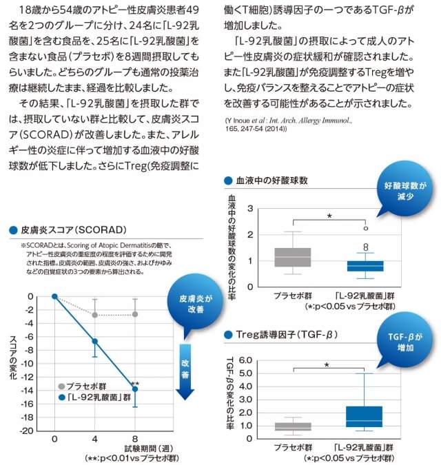 结果表明,吸收了「L-92乳酸菌」的群体对比没有吸收「L-92乳酸菌」的群体,其皮炎得分(特应性皮炎积分)得到了改善。并且随着过敏性炎症增加的好酸球数也降低了。更神奇的是Treg(致力于免疫调整的T细胞)诱导因子当中的TGF-β得到了增加。