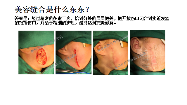 二、最精细的美容缝合:让刀口尽量“细”,比如超减张缝合,外部减张,免拆倒刺线,伤口胶水,尽量不留针脚疤痕并维持细小。