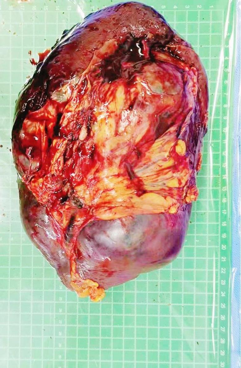 患者,女,60岁,因右足底恶性黑色素瘤伴脾转移,脾脏巨大,患者腹胀明显,食物下降,血红蛋白73g/L,近日手术切除,目前恢复良好。