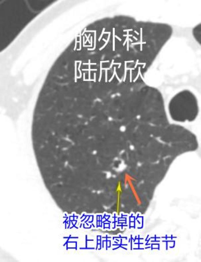 上图为右上肺另外一个结节,这个结节大约8mm,但是密度高,是实性结节,结节左上角是一个囊状小空泡,结节向囊腔内形成不规则小突起。估计突破微小浸润性腺癌,达到早期的浸润性腺癌阶段。当地医院可能以为是一根支气管,所以没看见。