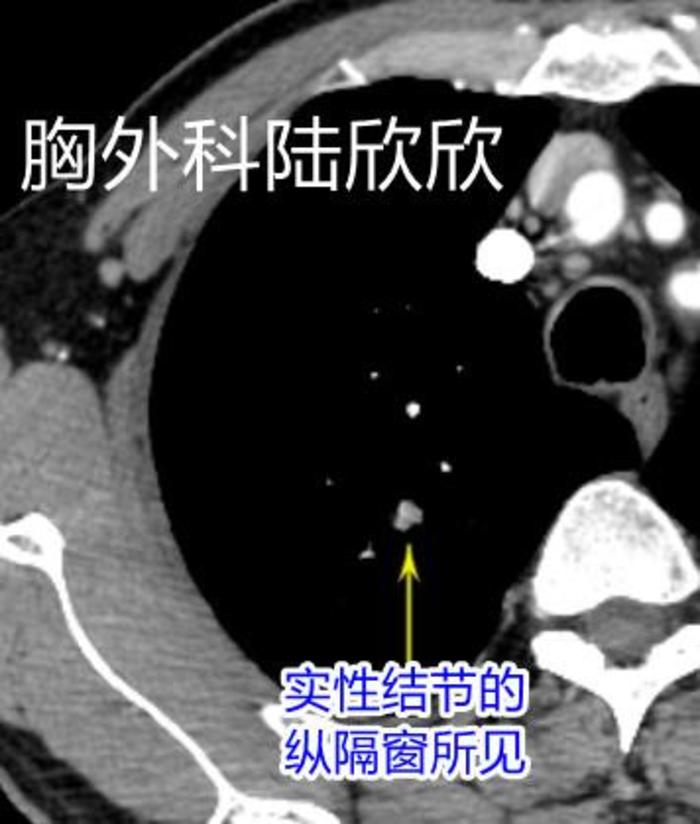 (2022.3.24修改此文添加下面一句话:这个结节在十几年前是一个囊腔型腺癌,就是说在囊腔旁有一个磨玻璃结节,磨玻璃结节逐步增大、恶变以后,实性成分比例逐步增加,转变为完全实性结节)。