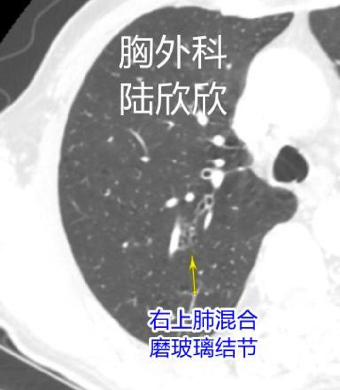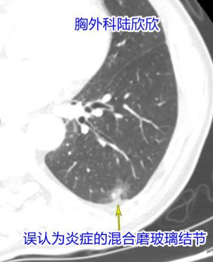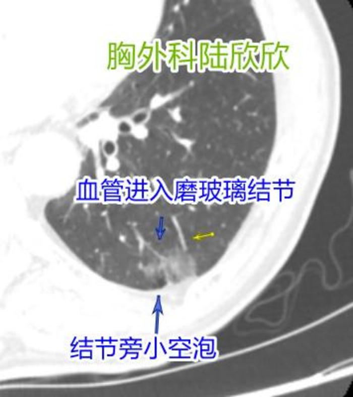我仔细看看,说:“这个磨玻璃结节的头侧还有一个偏实性结节,你们看在这儿。”