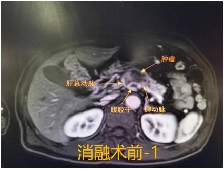 图1.患者胰腺肿瘤的解剖位置,可见肿瘤侵犯了腹部多支重要血管