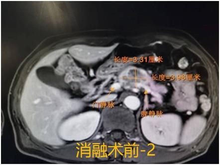 科主任彭吉润教授详细了解了病情,并仔细看了老王的磁共振扫描片子以后,告诉他们:“肿瘤位于胰腺体部靠近胰颈的部位,侵犯了重要血管(图1),传统意义上的手术是没法做了,但是可以通过手术探查,做微波消融治疗,结合术后辅助治疗,也能取得比较好的效果。”