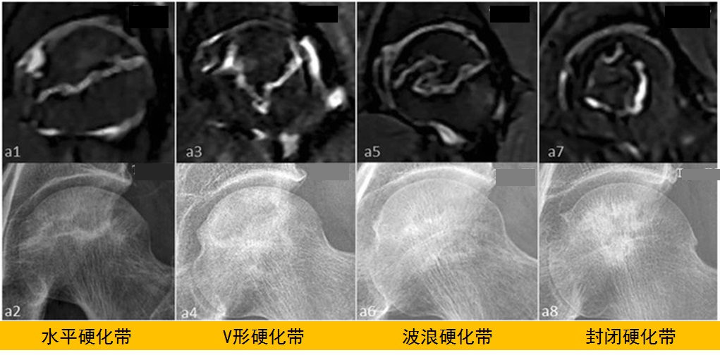 6. 硬化带形态与股骨头塌陷也有密切关系,磁共振上硬化带与软骨下骨板越接近甚至相连,股骨头不容易塌陷。如果硬化带呈环状闭合,2年内塌陷率几乎为零,硬化带呈波浪形或者V型,可适当减少塌陷的风险,硬化带为水平状,则坏死区在硬化带与股骨头球面之间,应力更为集中,更容易塌陷。