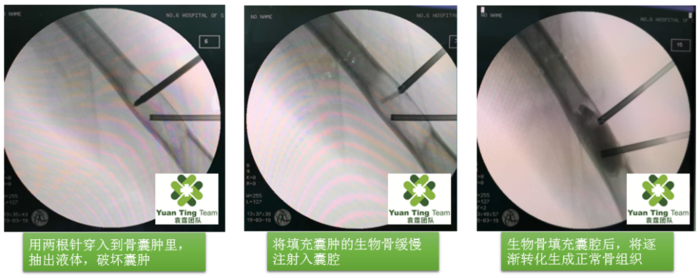 现在的手术是这样的,不用切开皮肤,只需要用两根穿刺针穿入到骨头,破坏肿瘤后,注射入一种液态骨头,就完成了治疗。做完手术后,病人麻药醒过来,一般第二天就可以下地走路