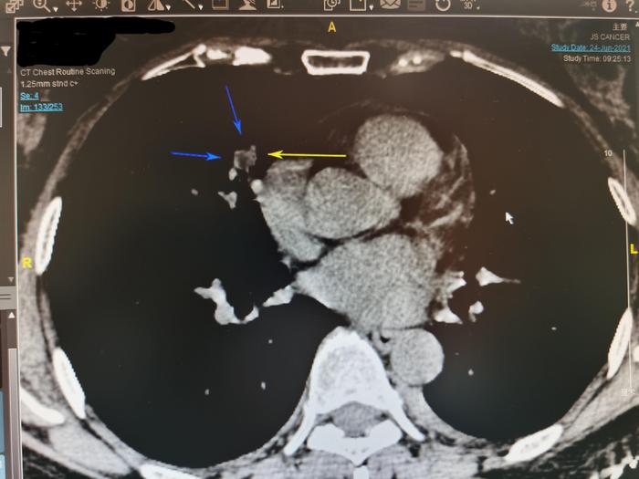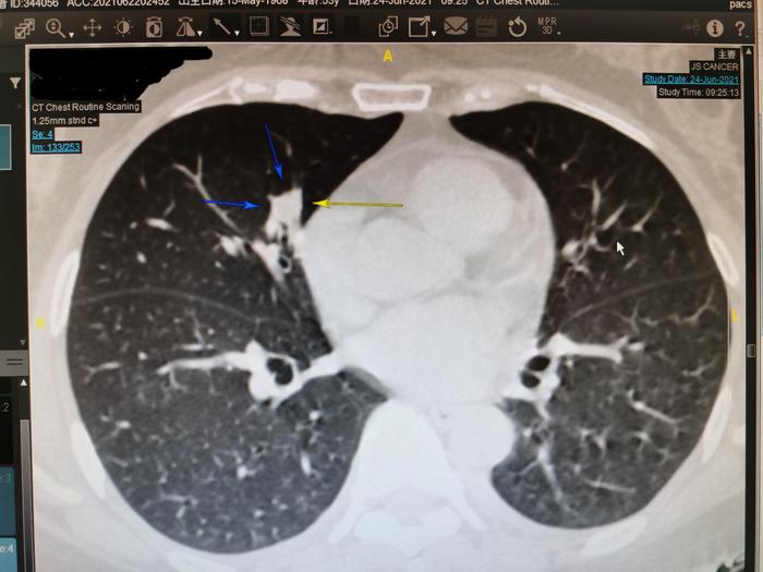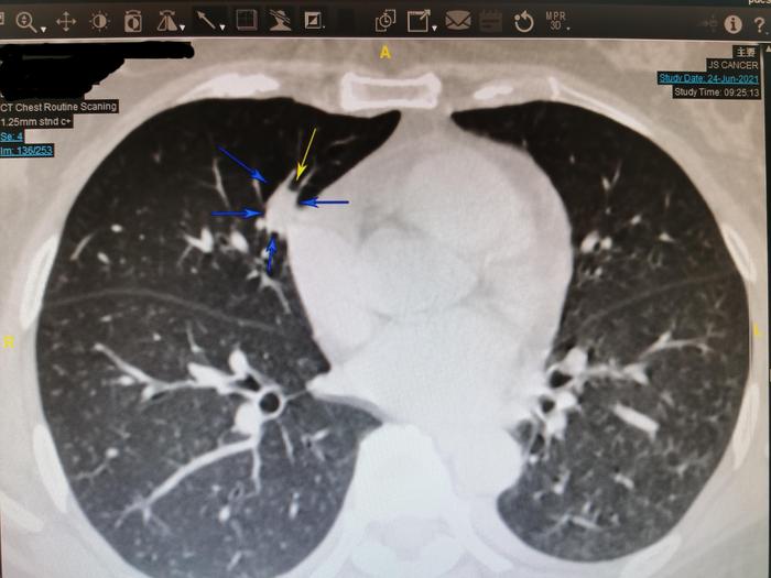 2021年6月的一个星期五上午,我在门诊接诊一个甲状腺癌术后患者。患者已经在外院做过两次甲状腺手术,术后病理有6个淋巴结转移。现在在我院复查CT,发现右中肺有一个结节,这个结节不除外转移。其它医院也认为不排除转移。这个患者想请我看看像不像转移,能不能手术治疗。