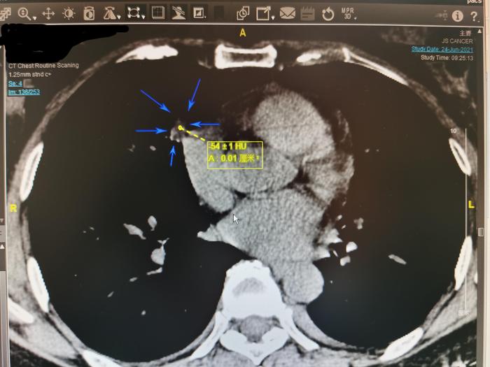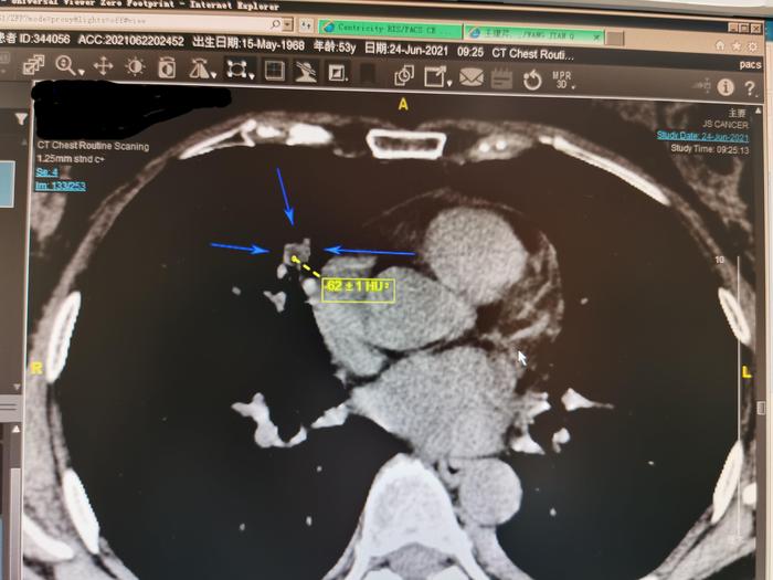 我看了一会儿CT。对患者说:“你的右中肺结节是一个实性结节,可以基本上排除转移,也不是原发的肺癌。我分析给你看看。”
