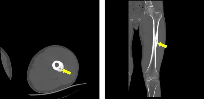 下面这两幅图片是一个骨样骨瘤的CT照片,可以看到,骨头上长出来一个像“牛眼睛”一样的东西,在医学上有一个专门的名字,叫“牛眼征”。
