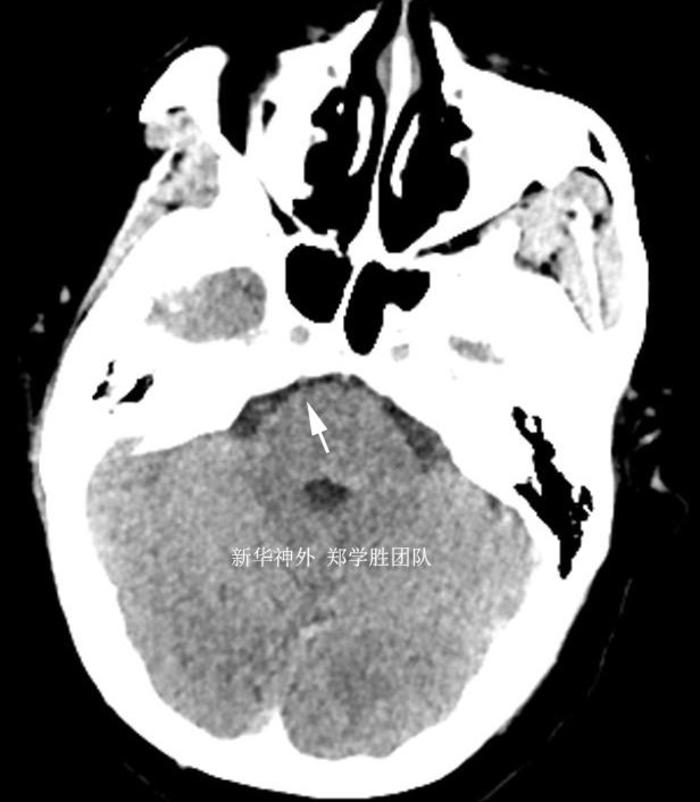 另外,由于心脏支架,不能做磁共振,术前只能做CT检查,CT不能看到三叉神经血管压迫的情况,只能排除有没有脑肿瘤。箭头所指的是三叉神经位置。