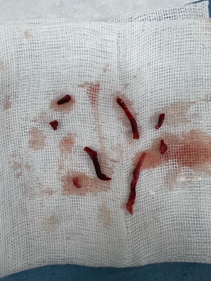 血管里的垃圾可以吸出来么??? 2022年03月15日 7734人阅读 返回文章列表 89岁女性,因右足背足趾发黑破溃3月入院,既往糖尿病,高血压病史多年。 术后造影发现右小腿动脉血流中断,考虑栓子脱落引起 术中行吸栓及球囊扩张治疗 治疗后小腿动脉血流通畅,右足皮温变暖 最后来看看术中吸出的栓子吧 顶 0 分享到: