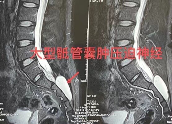 由于人体直立行走或站立时囊肿位于中枢神经系统脊柱椎管的最低位置-----骶管,其囊肿内静水压高,压迫和牵拉周围马尾神经中的骶神经和尾神经,导致神经支配区(臀部、肛门周围、会阴区、外阴或外生殖器、大腿后侧、小腿后侧及下方外侧、脚踝外侧、足背和足底外侧等)相应的疼痛、麻木、酸胀、无力、大小便功能障碍,甚至性功能障碍。