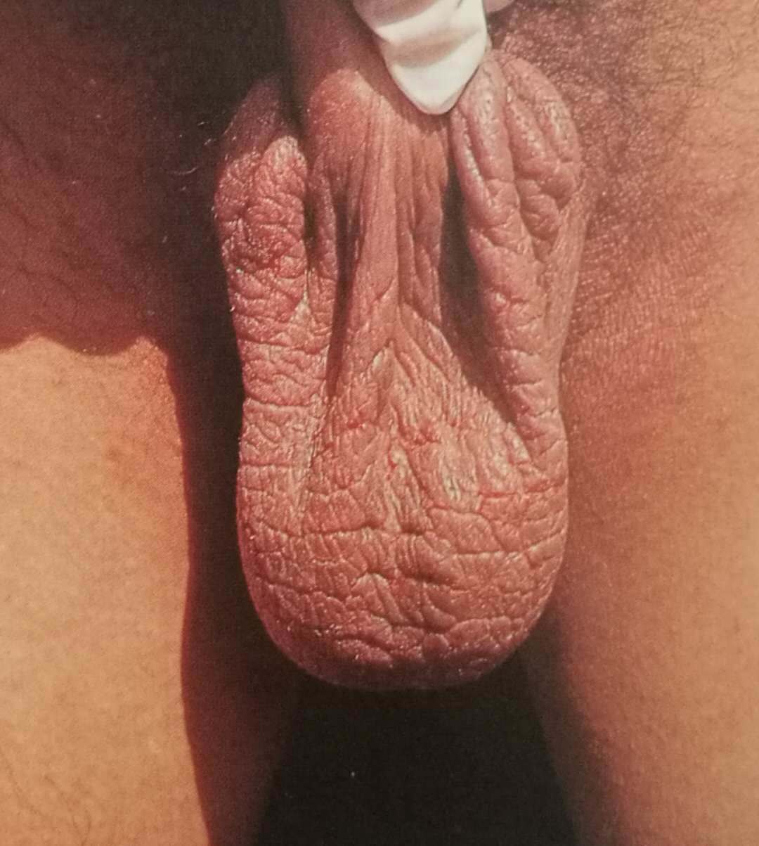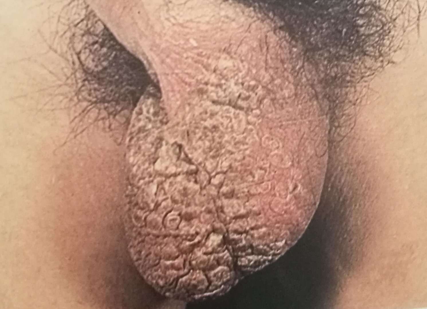 (1)阴囊神经性皮炎 可见连成片的扁平丘疹,严重者遍布整个阴囊。其特点是,虽有瘙痒,但无渗液,日久皮肤变厚,呈席纹状。