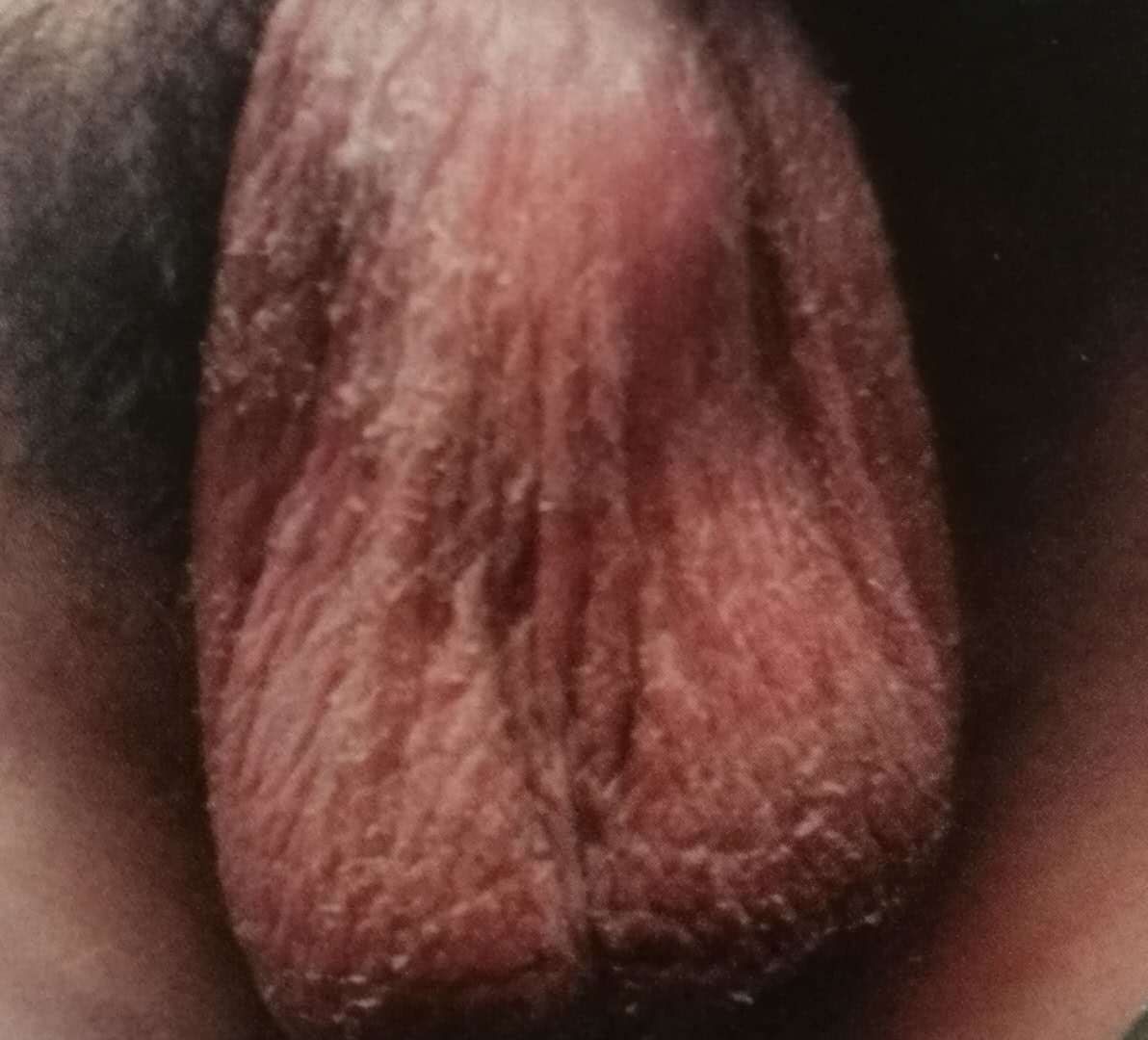 3.慢性阴囊湿疹:慢性阴囊湿疹表现为阴囊皮肤逐渐增厚粗糙,呈暗红或灰褐色,皱褶肥大,有鳞屑附着,可因剧痒瘙抓后出现糜烂、渗液等急性或亚急性阴囊湿疹的症状。慢性湿疹根据临床表现分为干燥型和潮湿型两种。潮湿型整个阴囊肿胀突出,有轻度糜烂、溢液、结痂和显著浸润、肥厚,皱纹深阔,稍发亮,色素加深,阴囊比正常显著增大,由于严重瘙痒间有累累抓痕。另一种为干燥型,水肿变厚不如前者突出,有薄痂和鳞屑,呈灰色,由于浸润变厚,间有裂隙,可有不规则的色素消失。