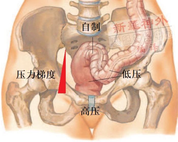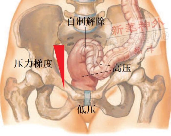 排便状态下,结直肠肌及腹肌收缩,使得肠腔内压力及腹压升高,同时内外括约肌及耻骨直肠肌反射性松弛,使得肛管压力迅速降低,压力梯度发生逆转,排便动力大于排便阻力,粪便就从肛门排出,这一状态也称为自制解除。