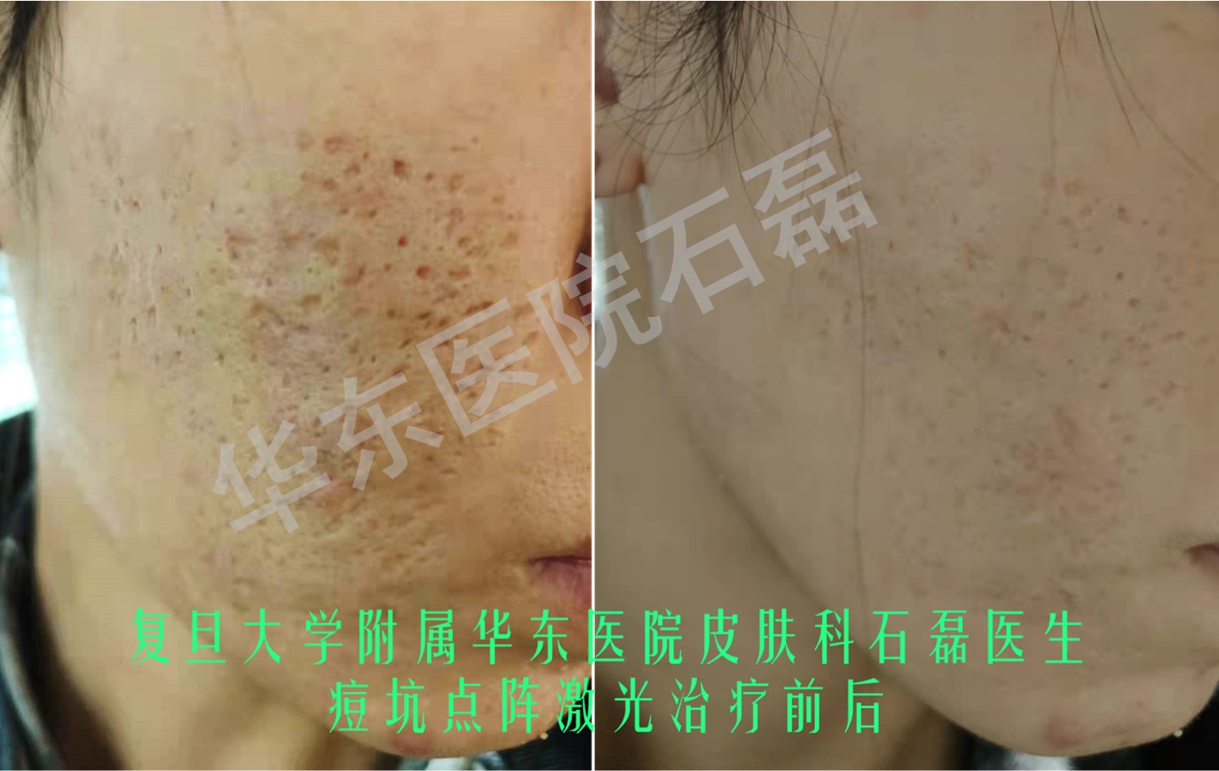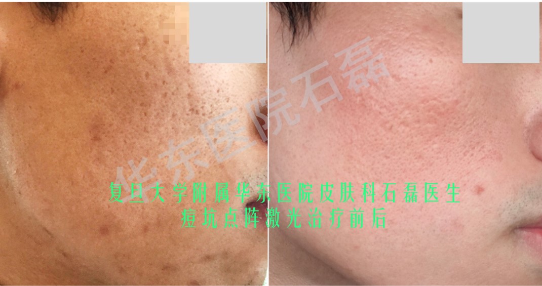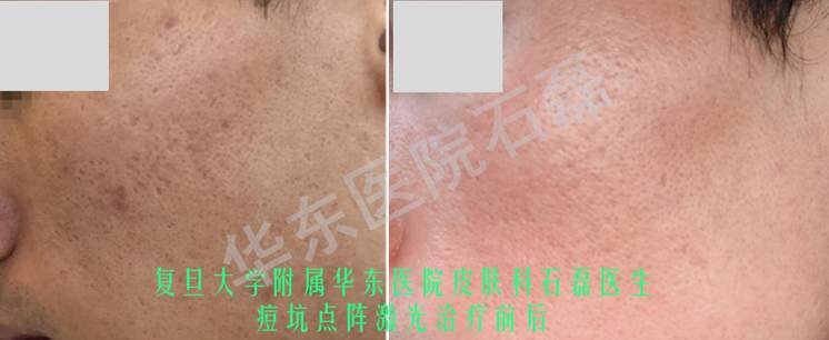 点阵激光治疗痘坑 疗效展示 2022年05月08日 6867人阅读 返回文章列表 痤疮最大的危害之一在于遗留瘢痕,石磊副主任聚焦点阵激光治疗凹陷性瘢痕(痘坑),颇具造诣,术中疼痛相对较轻,术后指导科学护理,修复效果好,多数情况下单次治疗便可初见成效,广受患者信任与好评。如下图展示的是治疗难度较大的冰锥型痘坑,单个痘坑开口面积小,但凹陷深,石磊副主任强调个性化参数选定,经过一个疗程治疗后此类难治疗的凹陷性痘坑亦获得了显著改善。 顶 0 分享到: