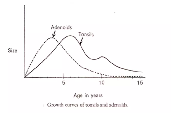 腺样体是长在孩子后鼻孔附近的一块软组织,正常情况下,腺样体的生长是有年龄规律,下图所示腺样体扁桃体生长年龄规律。