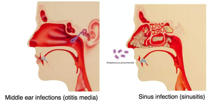 注:左:中耳感染(中耳炎);右:鼻窦感染(鼻窦炎)