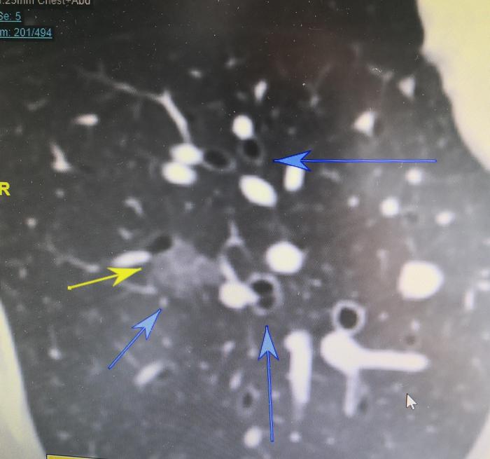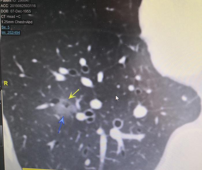上图(图5),是图4的放大图。黄色箭头和左边蓝色箭头指示的是右下肺基底段磨玻璃结节,磨玻璃结节内部图案出现乌龟壳上的花纹样改变。上边蓝色箭头指示的是右下肺前基底段支气管。右下方蓝色箭头指示的是右下肺外基底段支气管。
