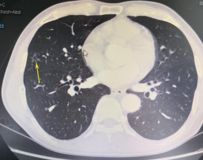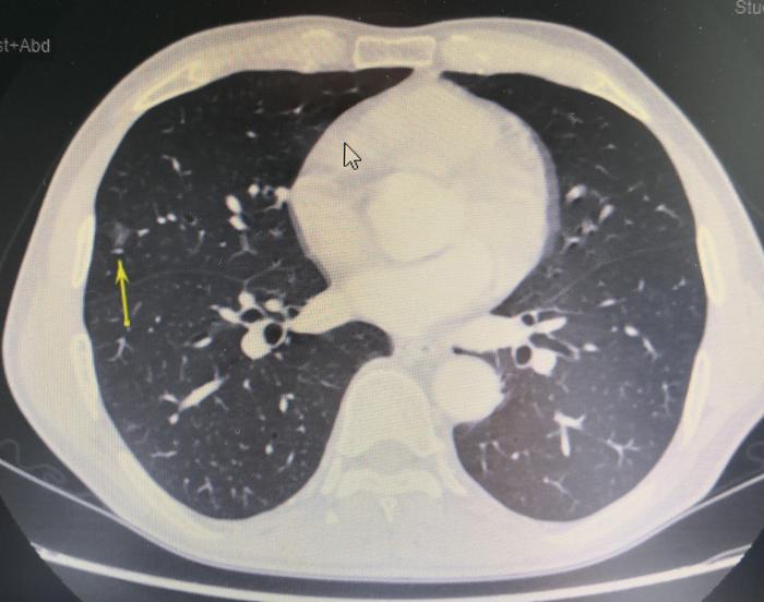 上图(图1),黄色箭头指示的是右中肺磨玻璃结节。
