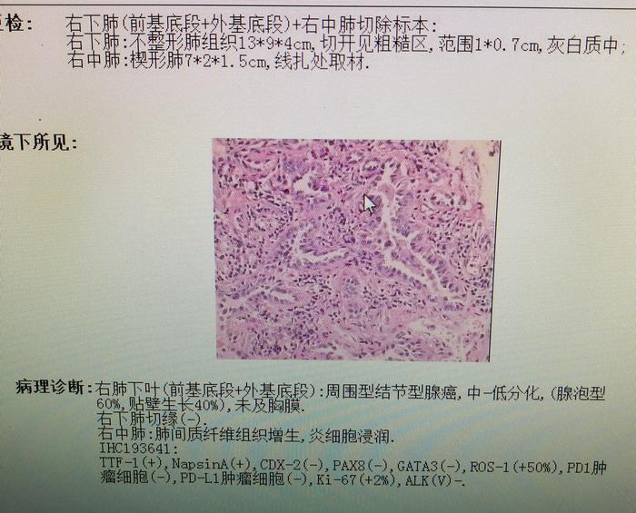 结果手术后的病理出来了。患者右中肺的磨玻璃结节是良性的:肺间质纤维组织增生,炎细胞浸润。我无意中发现的右下肺的磨玻璃结节反而是恶性的:周围型结节型腺癌,其中腺泡型占60%,贴壁生长型占60%。