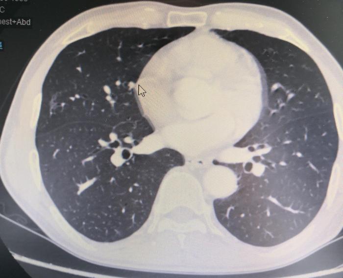 一年前,一个扬州女医生通过我院的医生介绍找到我,说她爸爸右肺中叶发现一个磨玻璃结节想住院治疗。病人已经在扬州抗真菌治疗12天,抗真菌治疗前后复查CT磨玻璃结节无变化。病人有高血压病10年,甲状腺功能亢进7年。类风湿性关节炎2年,口服氯羟奎(这个药也可以用来治疗新冠肺炎)、雷公藤治疗,最近静脉用过云克。