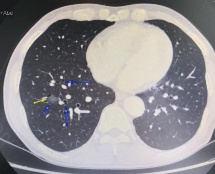 上图(图6),蓝色箭头指示的是右下肺磨玻璃结节。黄色箭头指示的是右下肺磨玻璃结节内部的扩张小支气管。这张CT位于上两张CT的足侧1mm。
