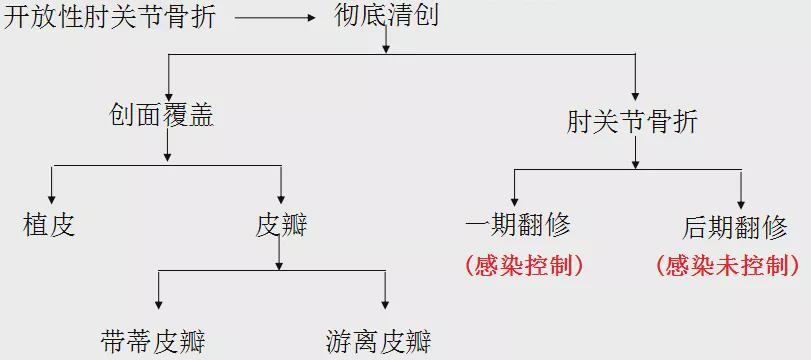 若清创后存在广泛皮肤软组织坏死、缺损、内固定暴露者,应尽早进行软组织重建,行皮瓣覆盖创面